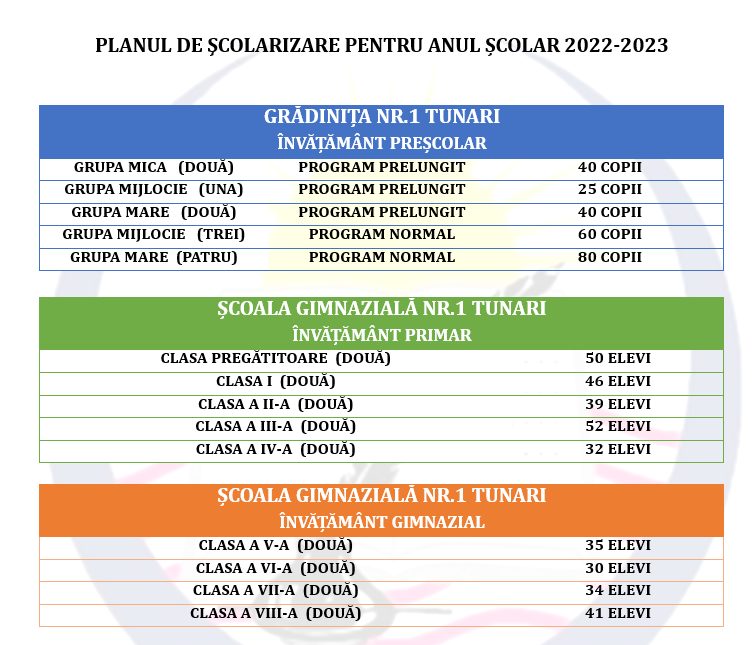 ANUNȚ PRIVIND ÎNSCRIEREA COPIILOR ÎN ÎNVĂȚĂMÂNTUL PRIMAR PENTRU ANUL ȘCOLAR 2022-2023 LA ȘCOALA GIMNAZIALĂ NR.1 TUNARI Pentru anul școlar 2022-2023 la ȘCOALA GIMNAZIALĂ NR.1 TUNARI au fost aprobate 2 (două) clase pregătitoare cu o capacitate de 22 locuri fiecare. Înscrierea copiilor în învățământul primar pentru anul școlar 2022-2023: PRIMA ETAPĂ: 11 APRILIE- 10 MAI 2022…
